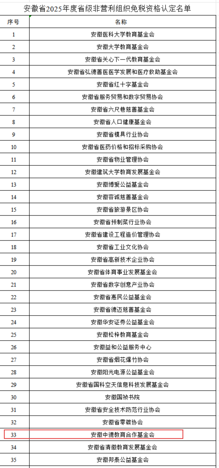 2025年11月18日,安徽省财政厅、家税务总局安徽省税务局发布皖财税法【2025】1183号文件,公布了2025年度省级非营利组织免税资格认定名单。安徽中德教育合作基金会名列其中。基金会于2020年2月24日正式登记注册成立,是经安徽省教育厅同意、安徽省民政厅批准的非公募基金会,重点支持中德高等教育合作及合肥大学发展建设。取得免税资格后,自认定年度起,五年内享受非营利组织税收优惠政策。